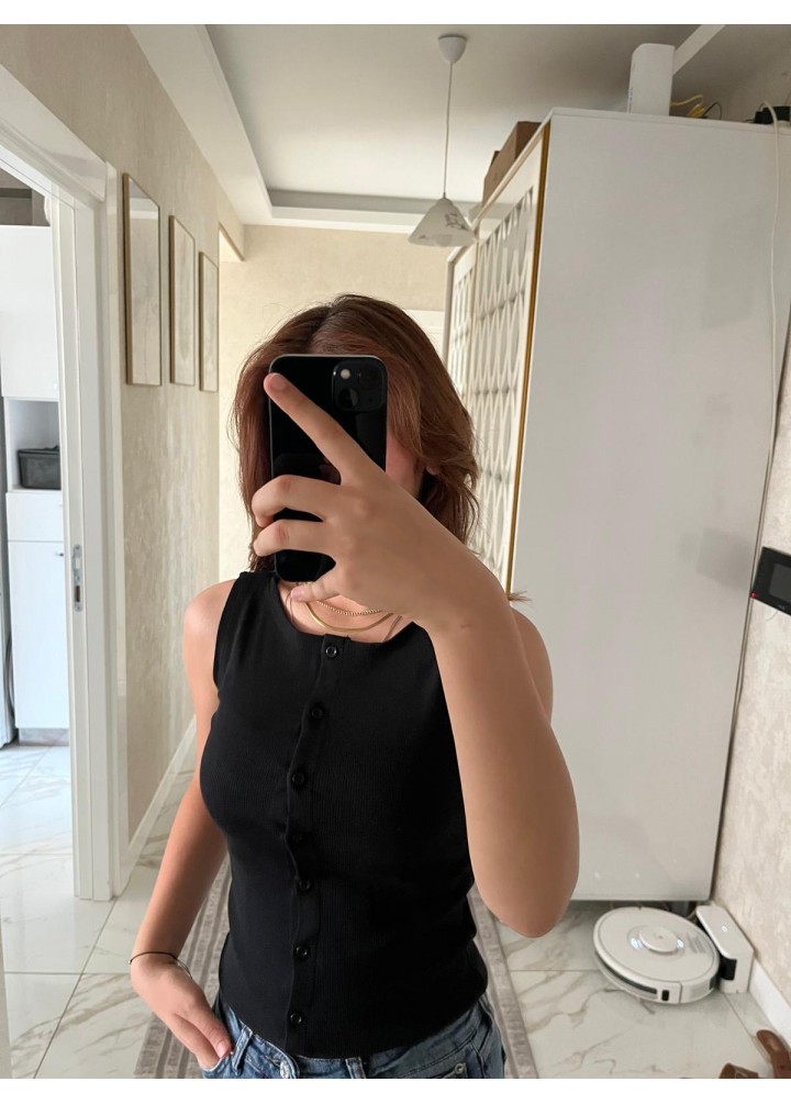 Siyah düğmeli üst pamuklu fitilli dokusu vardır.